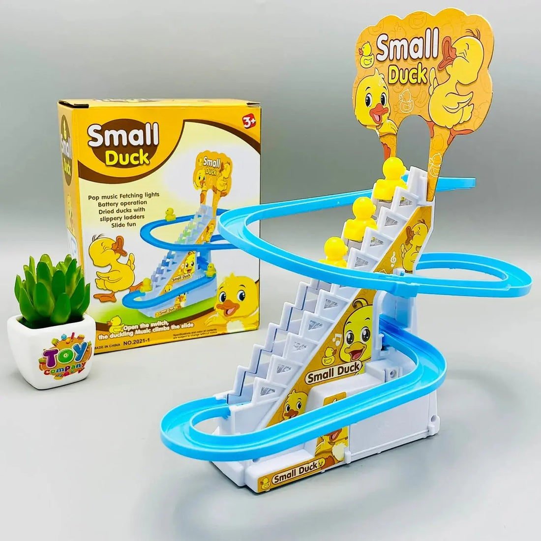 Features flashing LED lights, cheerful music (with on/off button), and cute yellow ducks that climb stairs and slide down fun tracks.